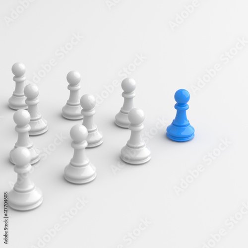 Leadership concept, blue pawn of chess, standing out from the crowd of white pawns, on white background. 3D Rendering