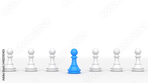 Leadership concept, blue pawn of chess, standing out from the crowd of white pawns, on white background. 3D Rendering