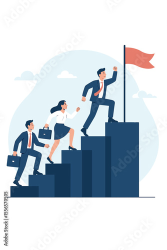Leadership concept with business team climbing stairs to success. A man leads his colleagues to a flag, symbolizing a goal. Metaphor for teamwork, motivation, ambition, and career growth.