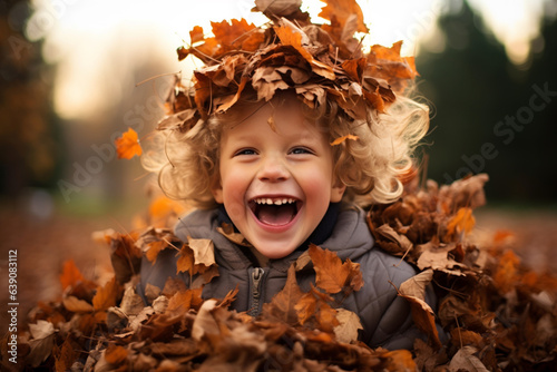 Leaf Pile Delight. a child playing in piles of fallen leaves with genuine smiles and laughter. the joy of autumn.