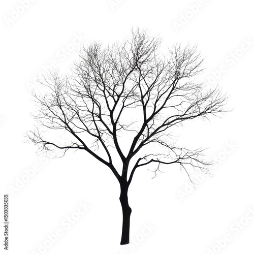 Leafless tree silhouette set against a bright white background in winter season, Isolated image a leafless tree silhouette on a isolated on white background