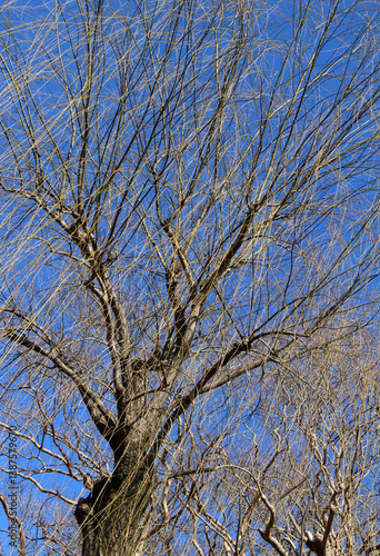 Leafless willow tree against the blue sky in a sunny day. Bare willow tree in winter background.