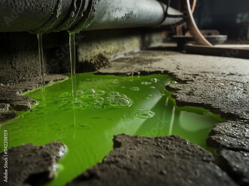 Leaking green liquid under pipe in dark industrial setting with cracked floor.
