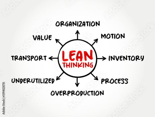 Lean thinking - transformational framework that aims to provide a new way how to organize human activities to deliver more benefits to society, mind map concept for presentations and reports