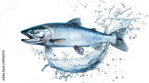 Leaping salmon fish with water splash, highly detailed fins and scales, hyper-realistic rendering, isolated on white background