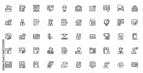 Learning icon set. Minimal vector illustration. Education symbols pack. Includes study, elearning, teacher, student, books, exam, tutorial, certificate and more. Editable stroke design.