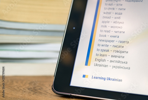 Learning Ukrainian using a tablet with books in the background.