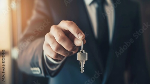lease rental and selling home Real estate agent manager smile holding key for new owner rent house Sales loan credit financial insurance Seller dealer installment buy sell move in : Generative AI