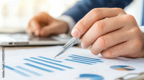 leasing asset valuation concept, A business professional analyzes data on paper, holding a pen and using a laptop in a well-lit office setting.