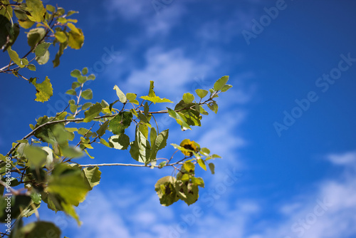 leaves lime green and yellowish early autumn tree and blue sky