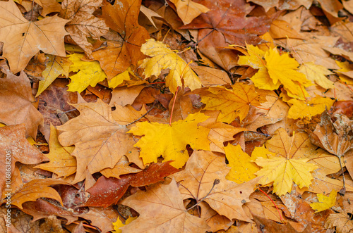 leaves of different colors and species fallen from the trees in fall, wet by the rain. Background for fall concept
