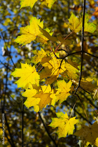Leaves of Norway Maple, Acer platanoides, in autumn against sunlight with bokeh background, selective focus, shallow DOF