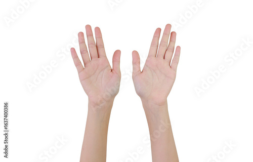 Left and right hand palm against white studio background. Finger hands girl with clipping path.