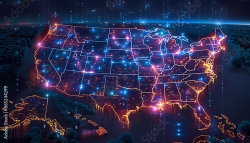 Legal and Compliance AI Applications, map of law firms and regulatory bodies in the USA with AI icons analyzing legal documents and compliance data,