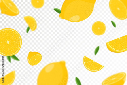 Lemon citrus background. Flying Lemon with green leaf on transparent background. Lemon falling from different angles. Focused and blurry objects. Flat cartoon vector.