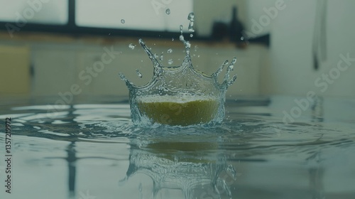 Lemon slice drops in water, creating splash effect in kitchen setting for healthy lifestyle blogs