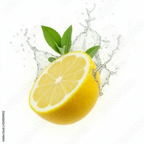 Lemon Water Splash Isolated On A White Background. Lemon Fruit Slice, Leaves And Water Splash. Background Water Wave, Citrus Piece And Mint Foliage Flying