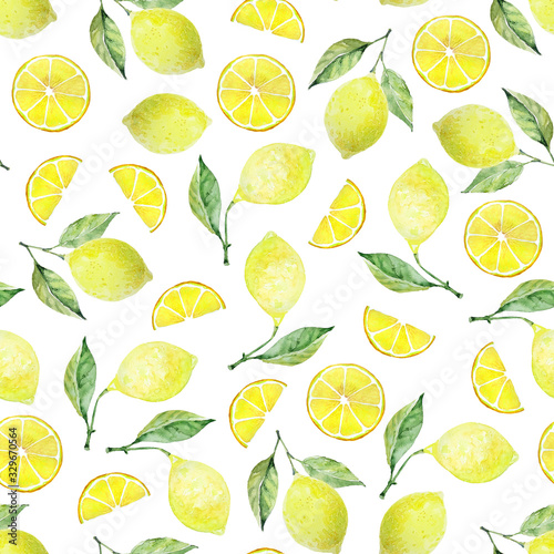 Lemon with leaves, lemon slice, half lemon slice in messy pattern on white background. Seamless watercolor illustration. Design for fabric, scrapbooking, packaging paper, wallpaper, wrap