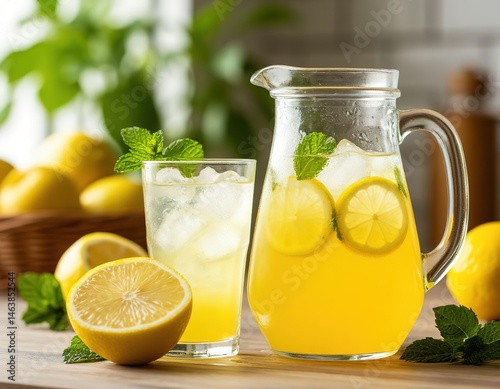 lemonade in glass cup and decanter. refreshing drink
