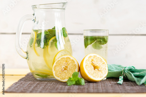 Lemonade with lemon and mint in a jug on a yellow rustic table.