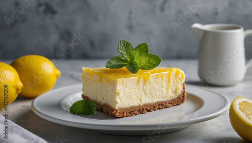 Lemon-flavored cheesecake with a zesty lemon topping, placed on a white plate with a garnish of lemon zest and mint leaves.