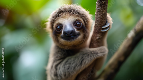 Lemur sitting on a tree in a jungle, looking cute and young.