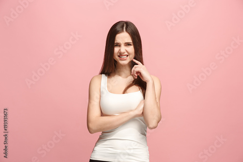 Let me think. Doubtful pensive woman with thoughtful expression making choice against pink background