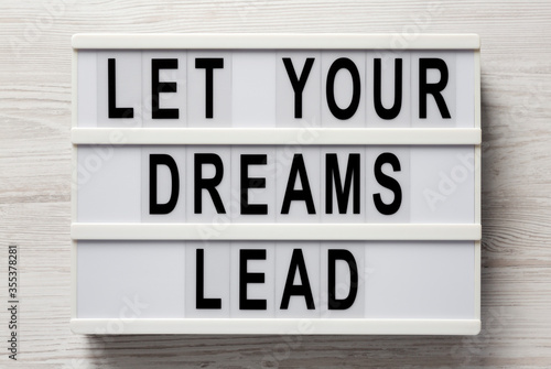 'Let your dreams lead' on a lightbox on a white wooden background, top view. Flat lay, from above, overhead.