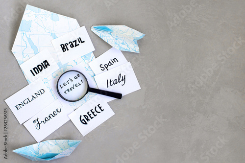 lets go travel text, country selection, map, magnifier, compass, gray background