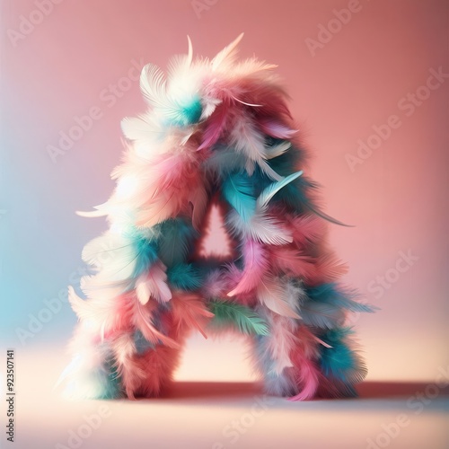 Letter A formed with pink, blue, and white feathers against a gradient pink and blue background, illuminated with soft light..Concept: Dreamy, ethereal beauty, whimsical typography.