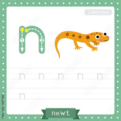 Letter N lowercase tracing practice worksheet of Eastern Red-spotted Newt
