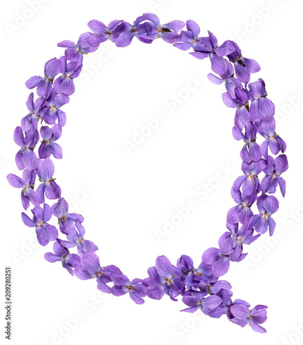 Letter Q from alphabet, from flowers of violet, isolated on white background