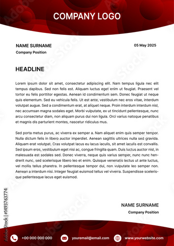 Letterhead template. Cover letter, corporate mail, newsletter. Business template, A4 format ready to print. Red banner with abstract pattern