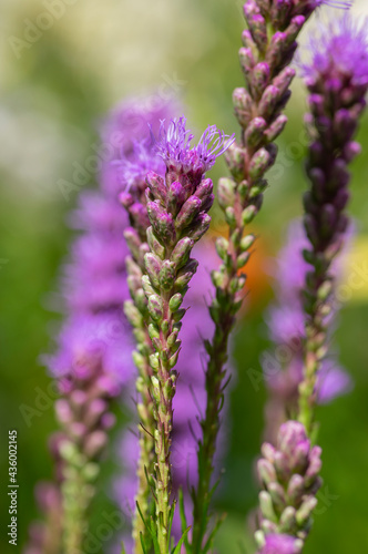 Liatris spicata deep purple flowering plant, group of flowers on tall stem in bloom