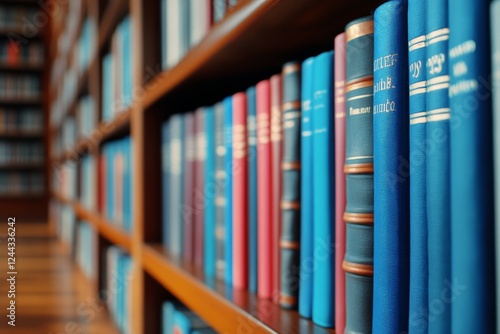 Library Bookshelf Collection - Rows of colorful books on a wooden bookshelf, showcasing a diverse collection of literature.