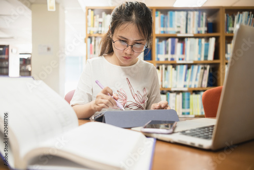 Library education concept, Asian teenage female student Using a stylus on a tablet and laptops in the library.