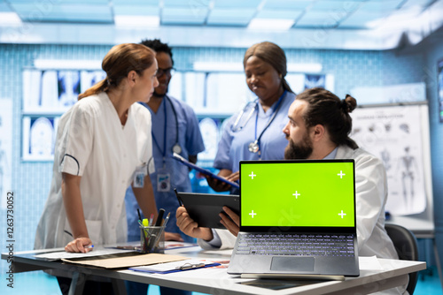Licensed doctor and his staff review x ray scan results next to isolated copy space screen, examining hospital records before putting a diagnosis. Consulting analytics and radiography.