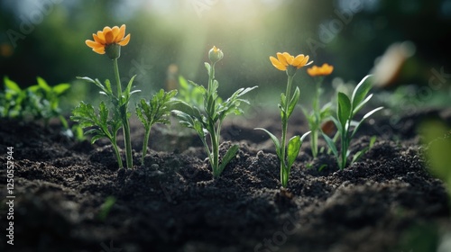 Life Cycle of Plants and Flowers Emerging from Soil in a Lush Garden Environment