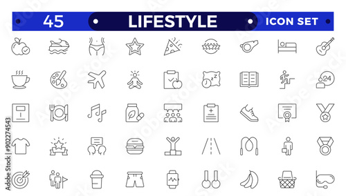 Lifestyle icon set. Containing healthy lifestyle, diet, exercise, sleep, relationships, running, routine, self-care, culture and hobbies icons. Outline icon collection.
