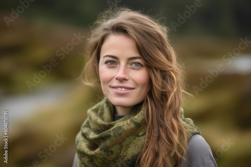 Lifestyle portrait photography of a grinning girl in her 30s wearing a charming scarf against a national park background. With generative AI technology