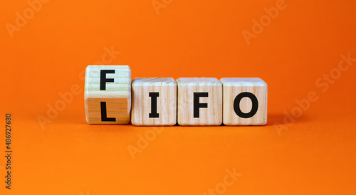LIFO or FIFO last in first out symbol. Changed concept words LIFO to FIFO on wooden blocks. Beautiful orange table orange background. Businessman hand. Business LIFO or FIFO concept. Copy space.