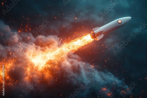liftoff to innovation sleek white rocket blasts off trailing dynamic plume of fire and smoke minimalist design on stark background symbolizes technological advancement entrepreneurial spirit