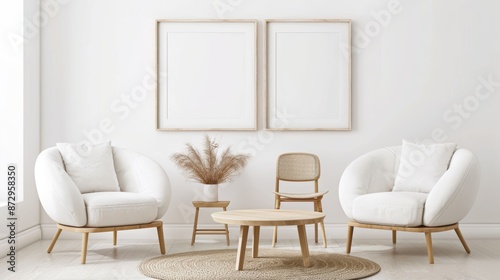 Light and airy living room with a blank canvas on the wall, neutral-toned furniture, and pampas grass, creating a cozy and minimalist vibe.