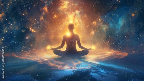 Light and balanced energy fields around a meditating figure in a cosmic backdrop