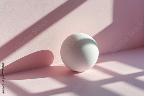 Light and shadow play on a marble sphere resting on a pink surface in a minimalistic setting