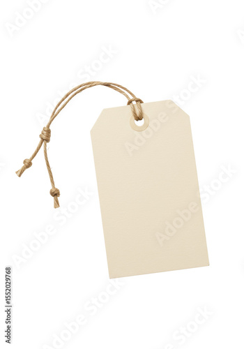 Light beige, pristine, rectangular paper tag with a rustic twine loop, empty and ready for use, presented against a transparent, shadowless studio background, emphasizing its clean, brand-new quality.