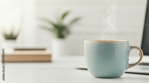 Light blue ceramic mug with steaming hot beverage on white office desk with a laptop and plants in background, creating cozy atmosphere