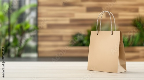 Light brown paper shopping bag on a light wooden table, with a blurred background of plants and wood paneling