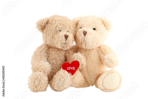 Light brown teddy bears with red heart isolated on white background. Valentine's Day.