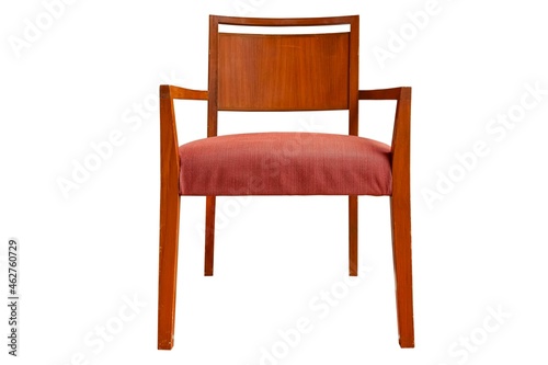 Light brown wooden chairs and reddish brown fabric cushions isolated on a white background